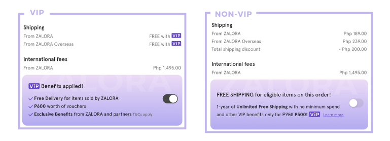 For the full length of your ZALORA VIP subscription (1 year), You'll get free shipping for items sold by ZALORA both local and overseas.
