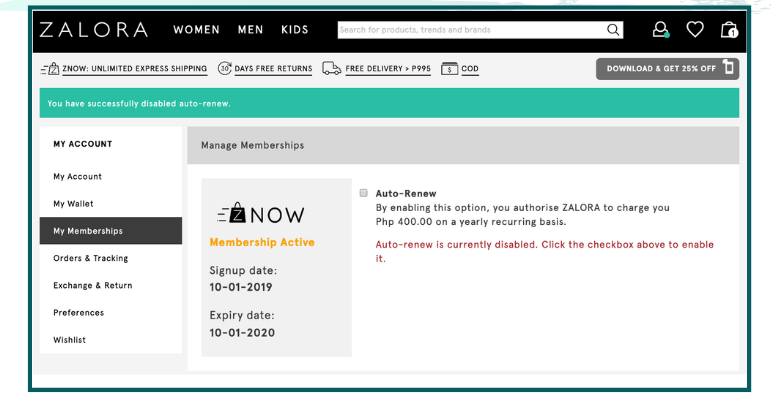 But don't worry! You can opt out of auto-renewal at any time by going to My Account > My Memberships. If there's a ZALORA VIP promotion at the time of the auto-renewal, you'll be renewed at the promotional price!