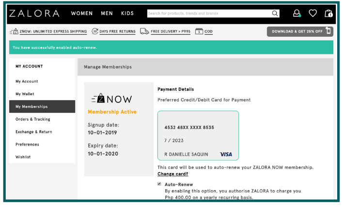 If you used Cash on Delivery, Paypal, or Gcash to pay for your ZALORA VIP subscription, you can choose to opt into auto-renewal by going to My Account > My Memberships. You will be asked to input a Credit Card/Debit Card or choose one from your existing account, where the subscription fee will be charged to.
